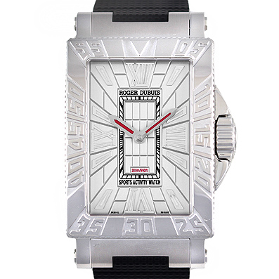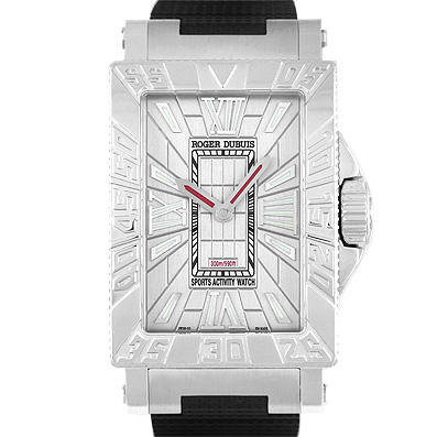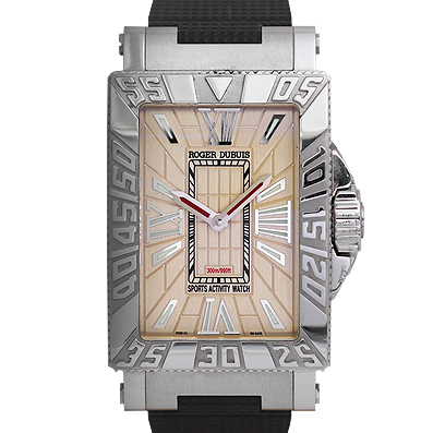 レクタンギュラー(長方形)ケースのクラシカルテイストが魅力のシーモア。四隅にコーナーを持つレクタンギュラーケースは、気密性の面で圧倒的に不利と言われながらも、驚異的な300m防水を実現。さらに驚くことに、バックスケルトンを採用しての数値という、ロジェ・デュブイの技術力を感じずにはいられないモデルです。